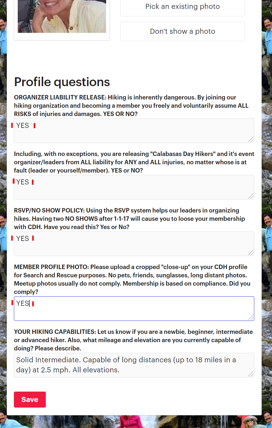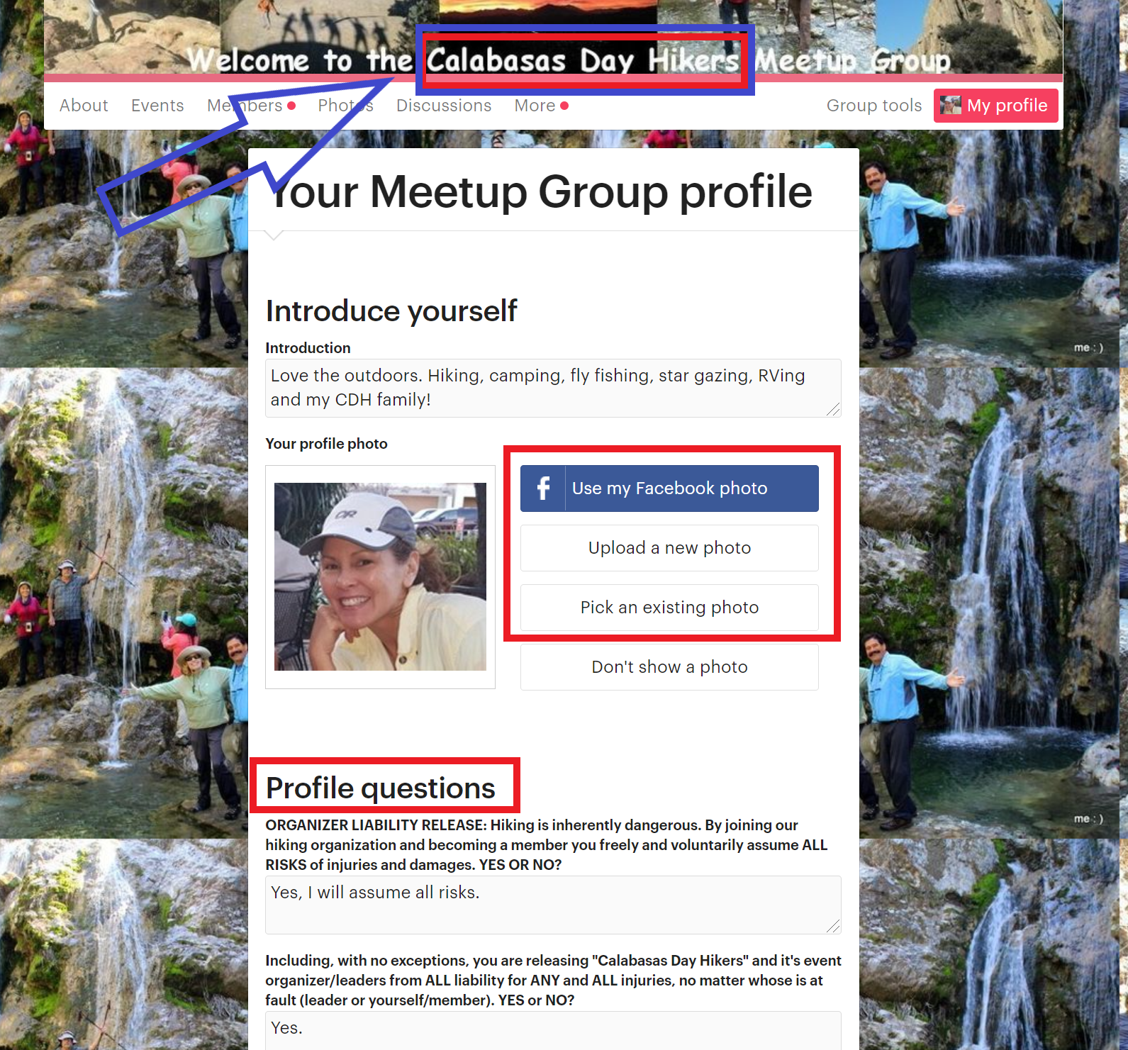 - IF you have been requested to change your profile photo, you need to change the “calabasasdayhikers” profile. Not your basic meetup photo. Your basic meetup photo you can have anything as some people do. Pets, plants, sunrise — etc. But for our group and for safety on the trail reasons, it must be a headshot.